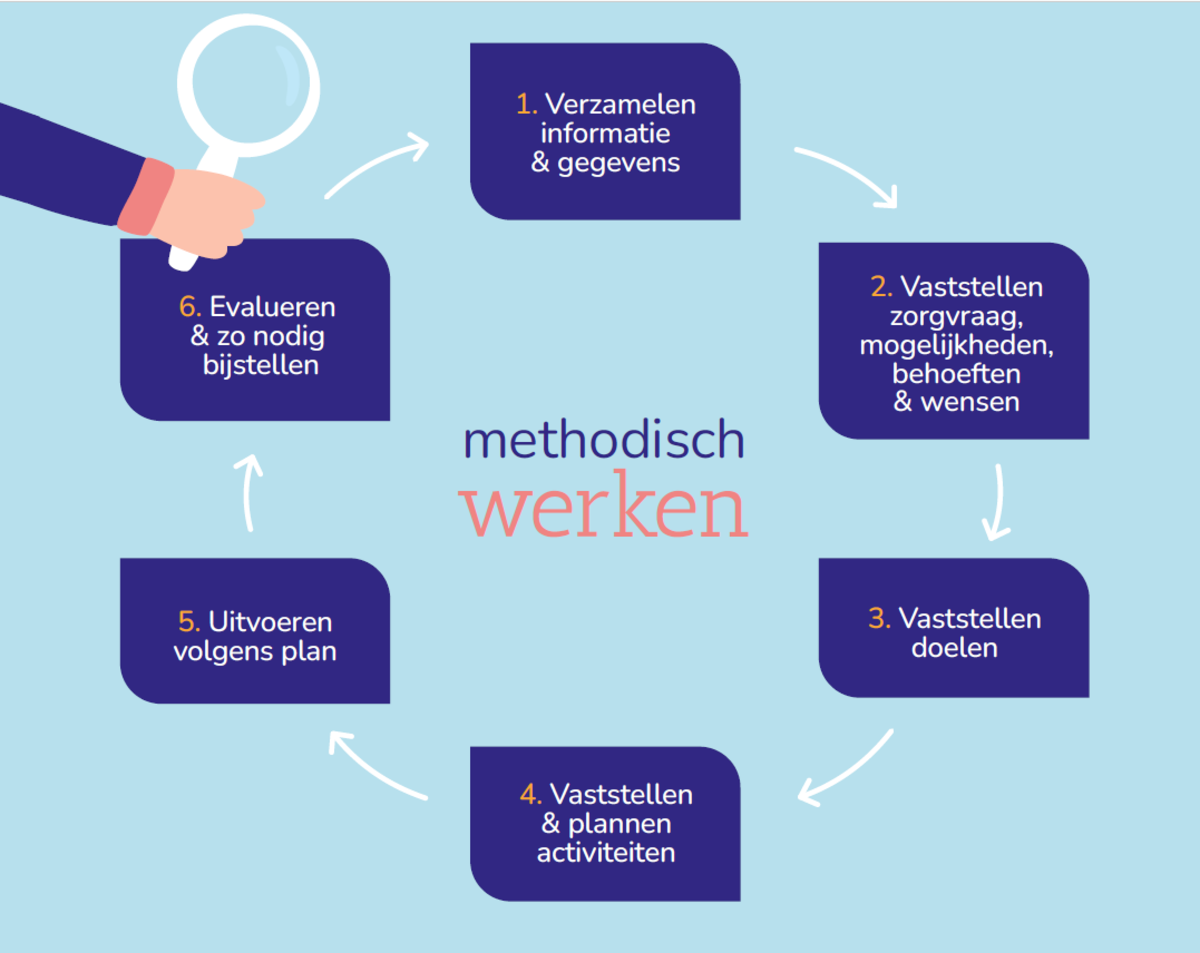Met het project methodisch werken staan we heel concreet stil bij het afstemmen van de juiste zorg en ondersteuning op de vragen, wensen en mogelijkheden van de cliënt. Dit doen we volgens de zes stappen van het methodisch werken.